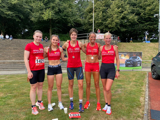 Johanna Pulte war die schnellste Frau im roten Trikot. Vor dem Start war sie noch unsicher und sprach von einer wahren Wundertüte was ihre Form betrifft, aber nach 17:10min war sie schon wieder zurück auf der Vestischen Kampfbahn, wie das 1928 eröffnete Stadion in Gladbeck offiziell heißt. Damit belegte sie in der Gesamtwertung den 2. Platz, direkt vor ihrer Teamkollegin Judith Hacker. Die Ottfingerin erreichte das zuvor ausgesprochenen Ziel "eine 17 vorne zu haben" mit einer Zeit von 17:42min deutlich und zeigte sich dementsprechend sehr zufrieden über ihre neue persönliche Bestzeit. Platz 1 in der W30 sprang zusätzlich dabei rum.